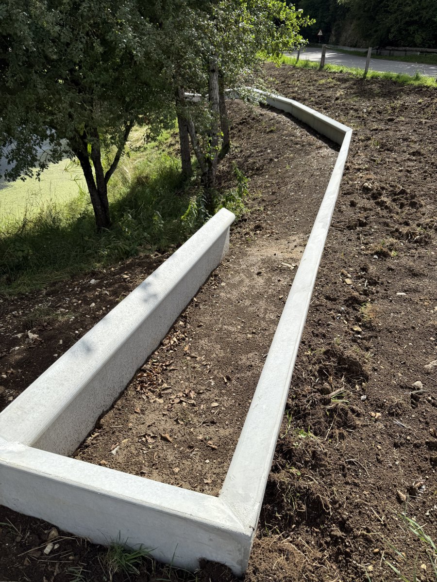 Nouveau mur côté sud de l'étang existant canalisant les amphibiens dans le crapauduc déjà existant avant ces travaux..